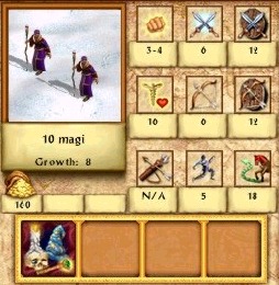 Alap Tulajdonságok: Dam: 9-12 Ma: 10 Md: 18 Hp: 60 Ra: 10 Rd: 18 Sh: N/A Sp: 6 Mm: 30 Speciális Tulajdonságok: Flying: A lényünk átrepülheti az akadályokat, szörnyeket, hősöket és várfalakat. Spellcaster: A harc alatt lényünk varázsolgathat különféle spell-eket. Cost: 550 Gold Growth: 6/week |