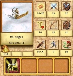 Dam: 2-3 Ma: 11 Md: 11 Hp: 12 Ra: 11 Rd: 11 Sh: N/A Sp: 3 Mm: 14 Speciális Tulajdonságok: Magic Resistance: Lehetséges, hogy a lény kivédi a leggonoszabb varázslatokat. Amely varázslatok sebzést okoznak, csökkenti sebzésüket. Cost: 28 Gold Growth: 18/week |